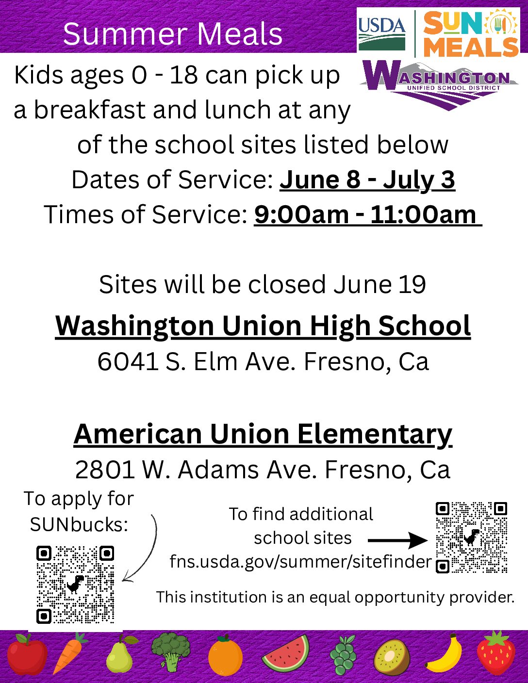 The Fresh Fruit and Vegetable Program is available at West Fresno and American Union. Â Both schools were awarded a school grant and with this additional funding students will receive free fruit and vegetables as a snack during the school day no less than four times a week!